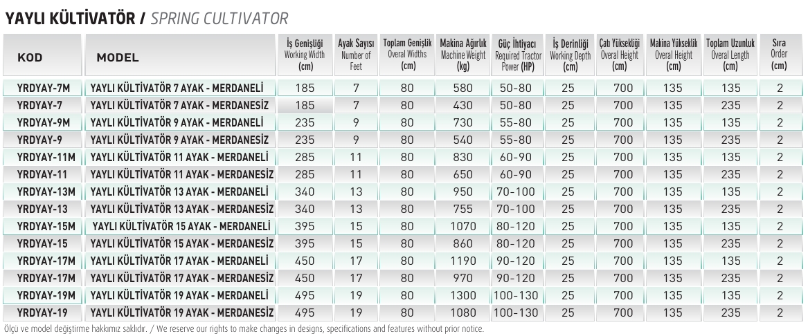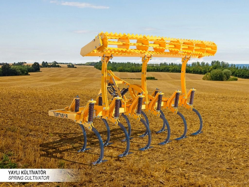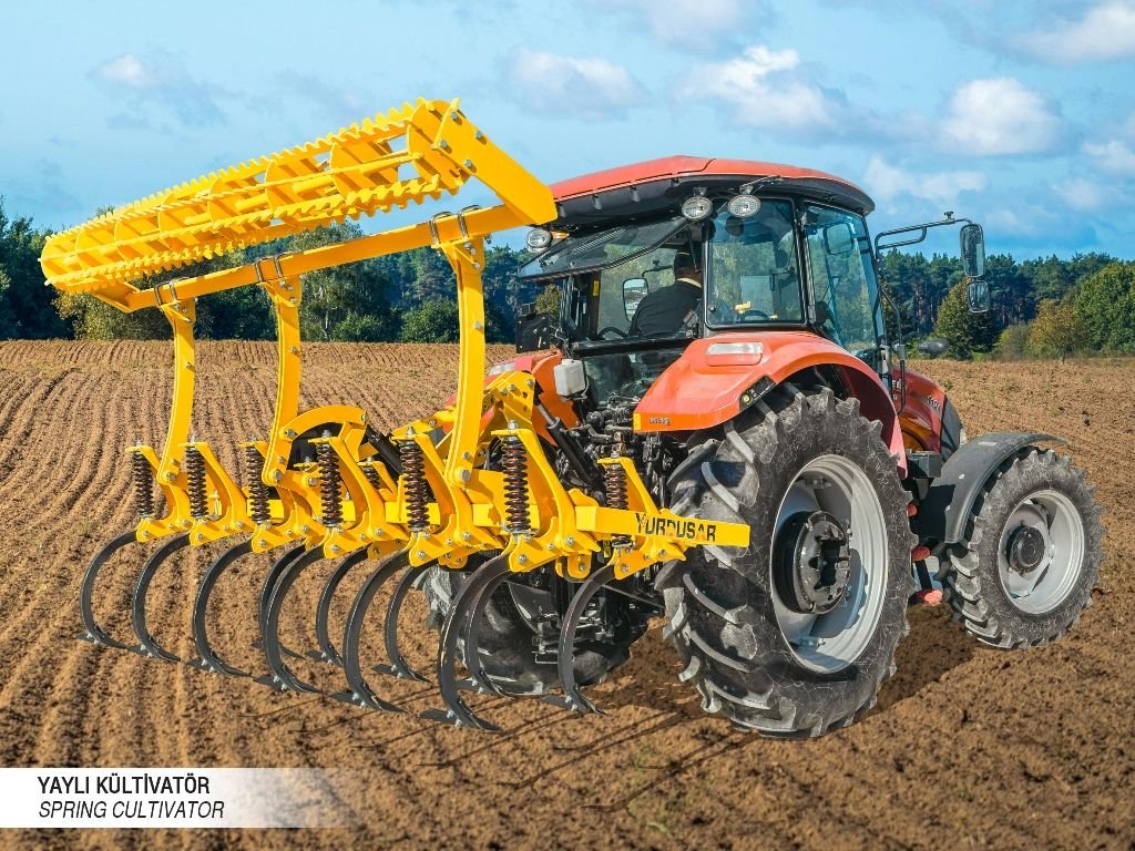 With our spring cultivator currently in production, operations such as soil ripping, loosening, aeration, cutting weed roots and bringing them to the soil surface can be performed. In addition, it enables the mixing of seeds or mineral fertilizers spread on the soil surface into the soil. Thanks to its spring system, the machine provides vibration-assisted and safe operation. The resulting vibration reduces draft force requirements and energy consumption. The cultivator creates a рых 20–25 cm deep loose soil structure and increases water permeability. It helps break up large clods and cuts weed roots, contributing effectively to weed control. Product technical specifications may be modified according to customer requirements. The manufacturer reserves the right to make changes to technical specifications and standard accessories. Product images are for general promotional purposes only. The stated required horsepower may vary by ±20% depending on soil conditions and tractor specifications (e.g., 4WD). The stated weights may vary by ±15% depending on optional equipment.